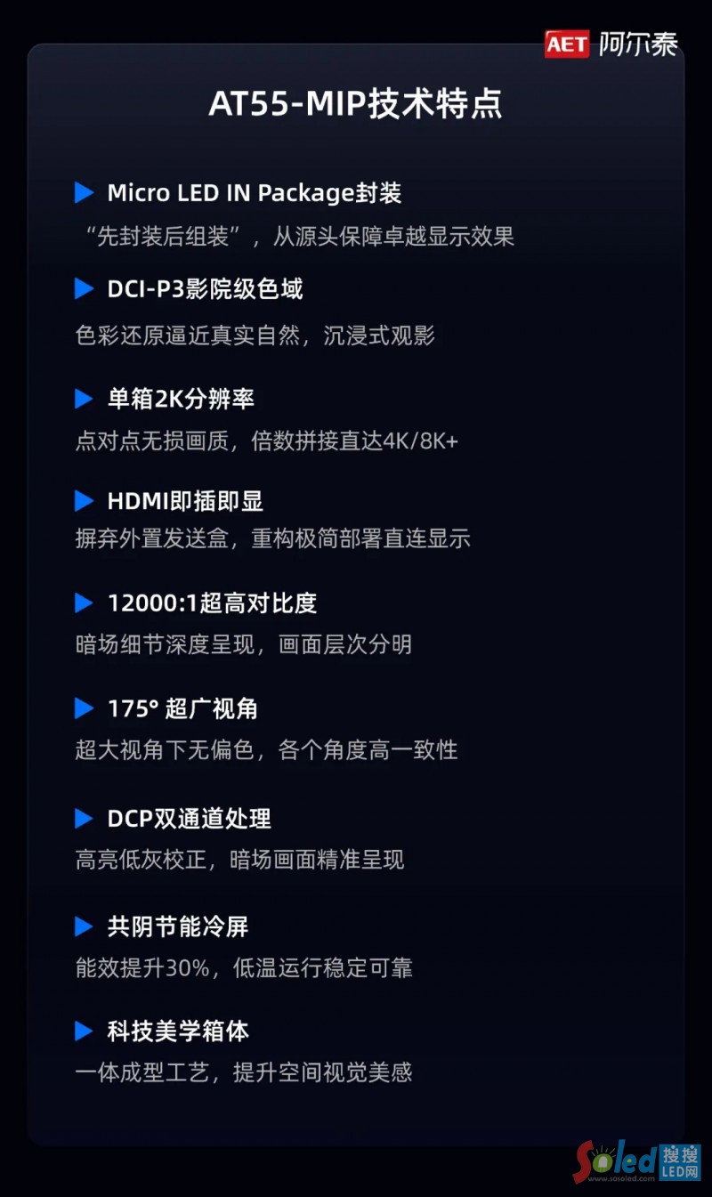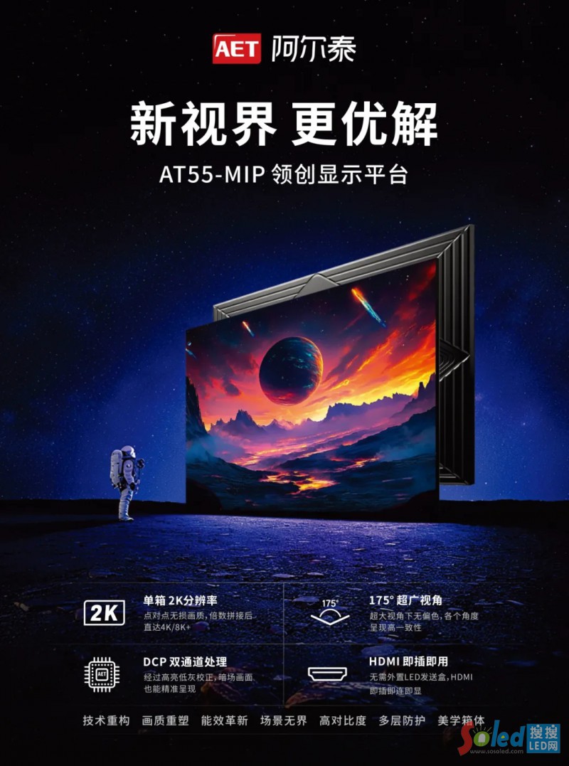AET阿爾泰正式發(fā)布AT55-MIP領(lǐng)創(chuàng)顯示平臺(tái),以"技術(shù)更優(yōu)、畫質(zhì)更優(yōu)、應(yīng)用更優(yōu)"實(shí)現(xiàn)全維迭代,傾力打造Micro LED超高清顯示的更優(yōu)解決方案。
