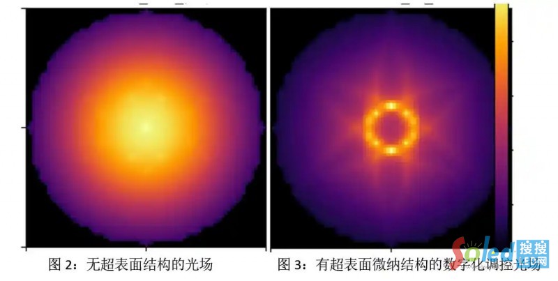 在完成電學(xué)與結(jié)構(gòu)集成的同時,鴻石智能在光學(xué)層面引入超表面(metasurface)技術(shù),對傳統(tǒng)光學(xué)路徑進(jìn)行重構(gòu)。該技術(shù)通過對光場進(jìn)行的“數(shù)字化編程”實現(xiàn)光的方向性的深度調(diào)制,極大提高了外量子效率(EQE),進(jìn)而提升整體出光效率。其核心價值體現(xiàn)在: