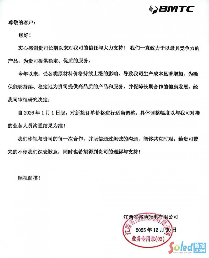2025年12月30日,兆馳光電發(fā)布聯(lián)絡(luò)函稱,因原材料價(jià)格持續(xù)上漲,生產(chǎn)成本顯著上升,自2026年1月1日起,將對新接訂單價(jià)格進(jìn)行適當(dāng)調(diào)整。具體調(diào)整幅度需與該公司業(yè)務(wù)人員對接確定。