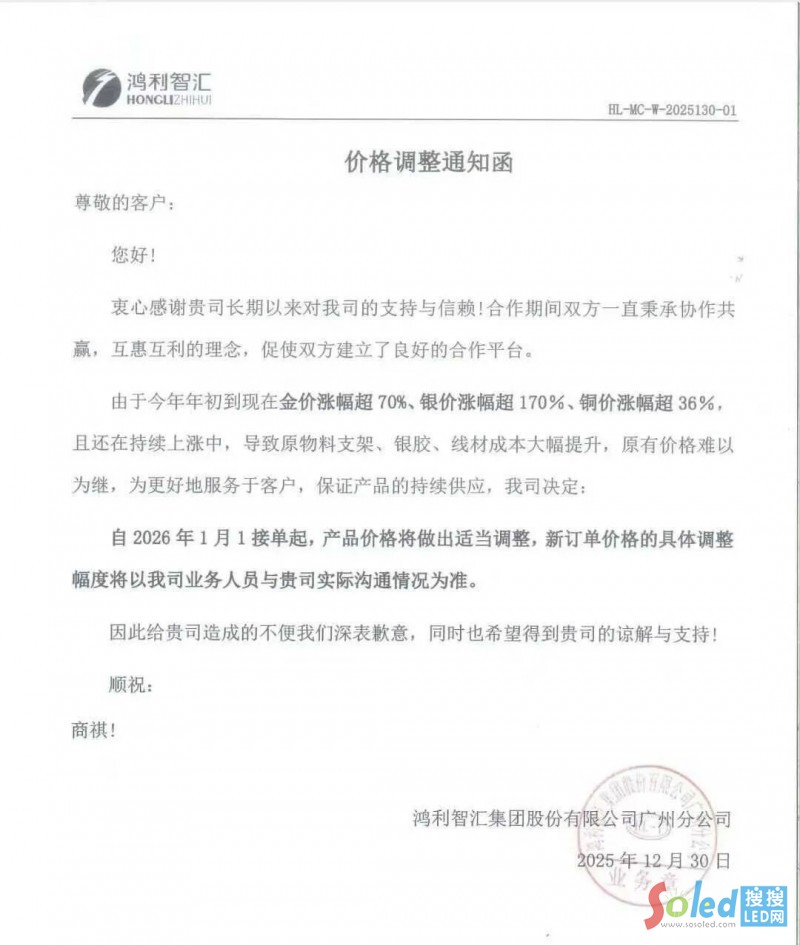2025年12月30日,鴻利智匯發(fā)布價(jià)格調(diào)整通知函稱,因2025年以來金、銀、銅等原材料價(jià)格持續(xù)大幅上漲,導(dǎo)致生產(chǎn)成本顯著攀升,鴻利智匯決定自2026年1月1日起,對新訂單執(zhí)行價(jià)格調(diào)整。具體調(diào)整幅度將由業(yè)務(wù)人員與客戶逐一溝通確定。