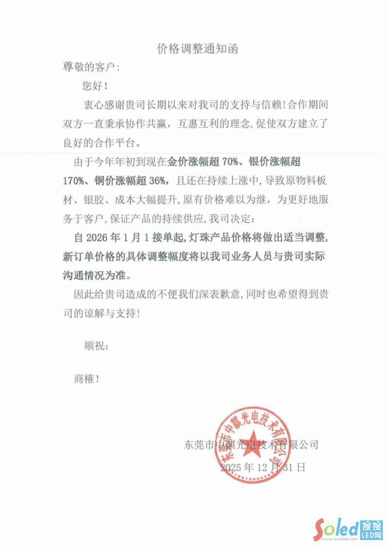 2025年12月31日,中麒光電發(fā)布價(jià)格調(diào)整通知,指出因今年以來金、銀、銅等原材料價(jià)格大幅上漲(金價(jià)漲超70%,銀價(jià)漲超170%,銅價(jià)漲超36%),導(dǎo)致板材、銀膠等成本持續(xù)攀升,原有價(jià)格已難以維持。為保障產(chǎn)品穩(wěn)定供應(yīng)與服務(wù)品質(zhì),公司決定自2026年1月1日起,對新接訂單的燈珠產(chǎn)品價(jià)格進(jìn)行適當(dāng)調(diào)整。具體調(diào)整幅度將由業(yè)務(wù)人員與客戶溝通確定。