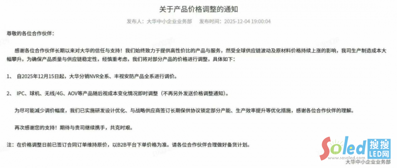 2025年12月14日,大華中小企業(yè)業(yè)務(wù)部發(fā)布了關(guān)于產(chǎn)品價(jià)格調(diào)整的通知,表示受全球供應(yīng)鏈波動(dòng)及原材料價(jià)格持續(xù)上漲的影響,我司生產(chǎn)制造成本大幅攀升。為確保產(chǎn)品質(zhì)量與供應(yīng)鏈穩(wěn)定性,經(jīng)慎重考慮,將對大華分銷NVR全系、豐視安防產(chǎn)品全系以及部分產(chǎn)品的價(jià)格進(jìn)行調(diào)整。