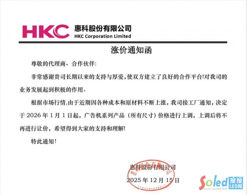 2026年12月15日,惠科股份發(fā)布漲價(jià)通知函表示,根據(jù)市場行情,由于近期因各種成本和原材料不斷上漲,我司接工廠通知,決定于2026年1月1日起,廣告機(jī)系列產(chǎn)品(所有尺寸)價(jià)格進(jìn)行上調(diào),上調(diào)后將不再進(jìn)行讓價(jià)。