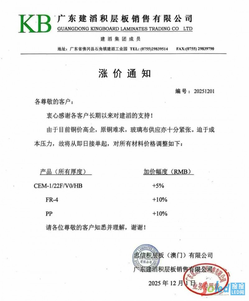 2025年12月1日,廣東建滔積層板銷售有限公司發(fā)布漲價(jià)通知,由于目前銅價(jià)高企,原銅難求,玻璃布供應(yīng)亦十分緊張。迫于成本壓力,故將從即日接單起,對所有材料價(jià)格加價(jià)5-10%。