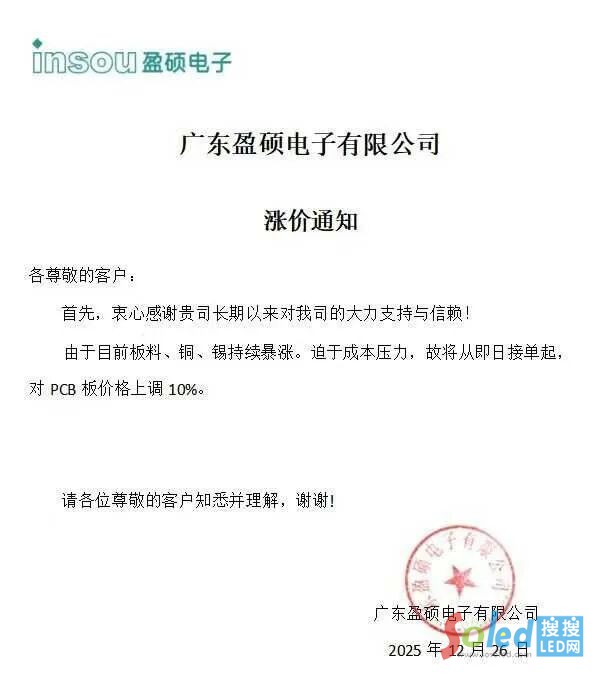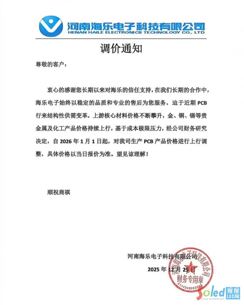 2025年12月29日,河南海樂電子發(fā)布調(diào)價(jià)通知表示,將PCB 板價(jià)格上調(diào) 10%,調(diào)價(jià)均從接單當(dāng)日或 2026 年 1 月 1 日起執(zhí)行。
