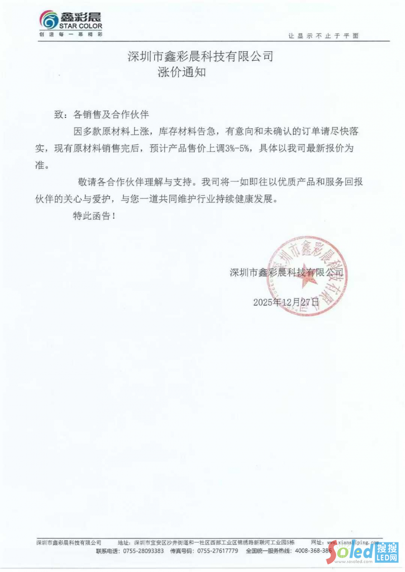 2025年12月27日,鑫彩晨發(fā)布漲價(jià)通知,明確現(xiàn)有原材料售罄后,產(chǎn)品售價(jià)將上調(diào) 3%-5%。