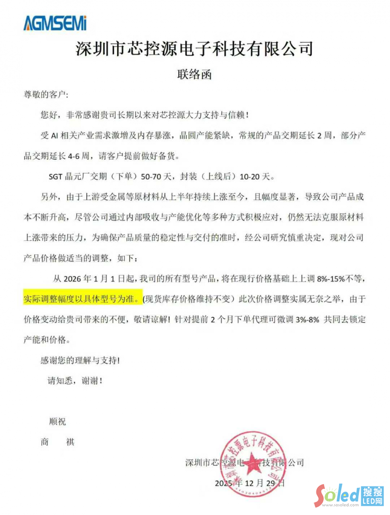 2025年12月29日,芯控源電子發(fā)布聯(lián)絡(luò)函表示,,受 AI 產(chǎn)業(yè)需求激增影響,內(nèi)存暴漲且晶圓產(chǎn)能緊缺,常規(guī)產(chǎn)品交期延長 2 周,部分產(chǎn)品交期甚至延長 4-6 周,進(jìn)一步加劇了成本壓力。在此背景下,公司將所有型號產(chǎn)品價(jià)格上調(diào) 8%-15%,僅現(xiàn)貨庫存維持原價(jià)。