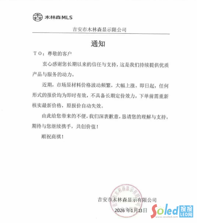 1月13日,吉安木林森發(fā)布通知表示,受近期市場原材料價格大幅波動上漲影響,即日起所有報價僅即時有效,無長期定價效力,下單前需重新核實最新價格,原報價自動失效。