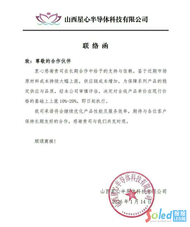 1月14日,星心半導(dǎo)體發(fā)布聯(lián)絡(luò)函表示,因近期原材料及供應(yīng)鏈成本大幅上漲,為保障產(chǎn)品穩(wěn)定供應(yīng)與品質(zhì),經(jīng)審慎評估,決定將全線產(chǎn)品價格上調(diào) 10%-20%,即日起執(zhí)行。