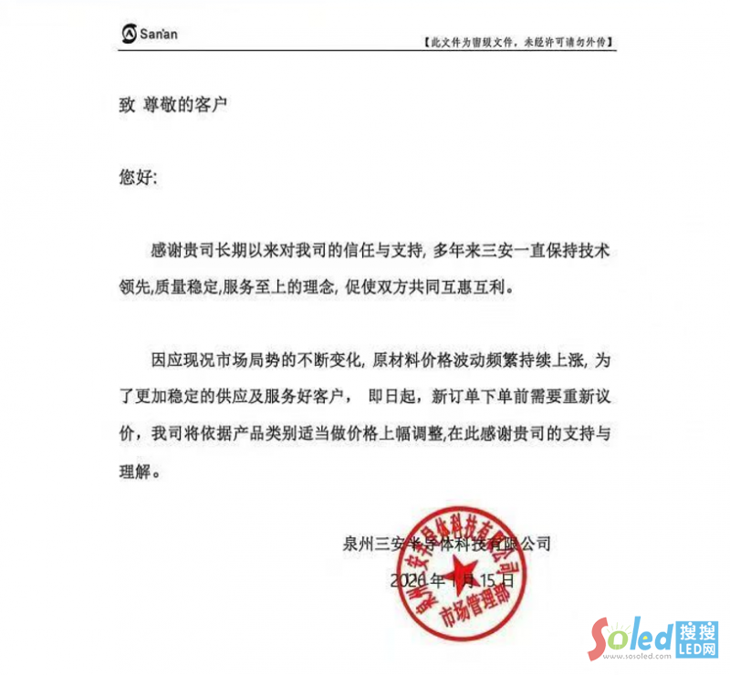 1月15日,三安光電表示,因應(yīng)市場局勢變化、原材料價格持續(xù)波動上漲,為保障穩(wěn)定的產(chǎn)品供應(yīng)與客戶服務(wù),即日起新訂單需重新議價,公司將按產(chǎn)品類別適度調(diào)價。