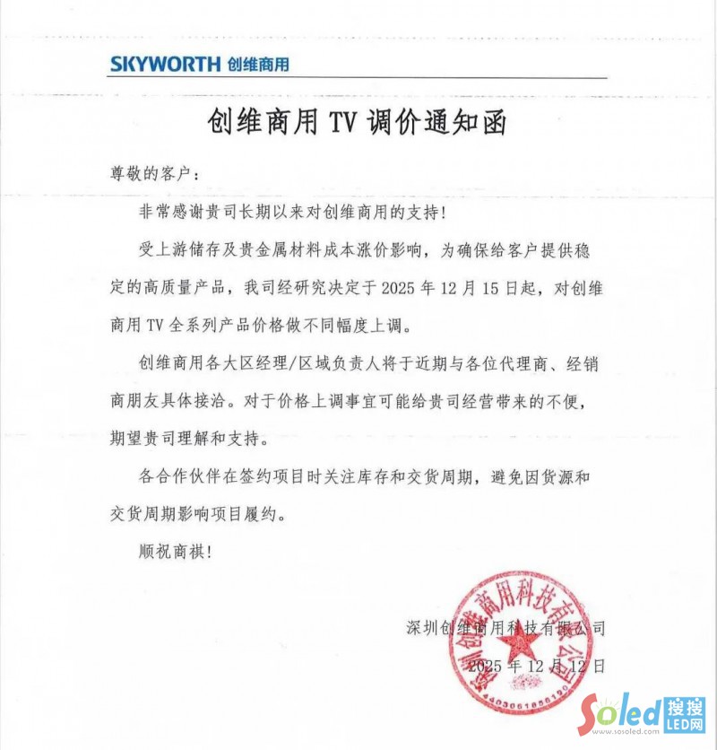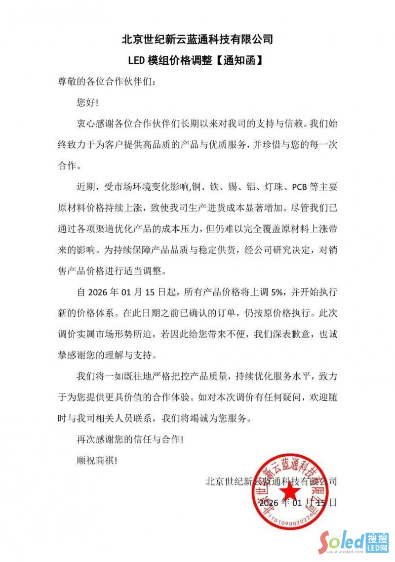 1月15日,創(chuàng)維商用發(fā)布LED模組調(diào)價通知函并表示,將2026年1月15日起,對所有LED顯示屏品類產(chǎn)品進行5-8%的漲幅上調(diào)。在此之前的訂單仍按原價格執(zhí)行。