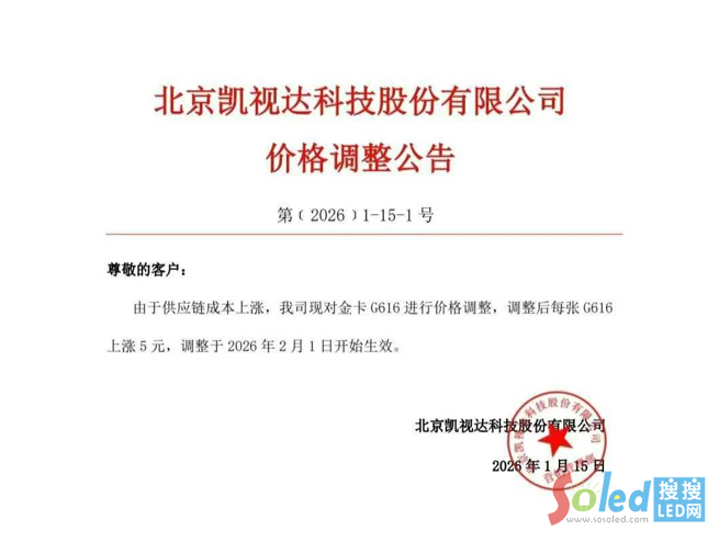 1月15日,凱視達(dá)發(fā)布價格調(diào)整公告稱,由于供應(yīng)鏈成本上漲,公司現(xiàn)對金卡G616進行價格調(diào)整,調(diào)整后每張G616上漲5元,調(diào)整于2026年2月1日開始生效。