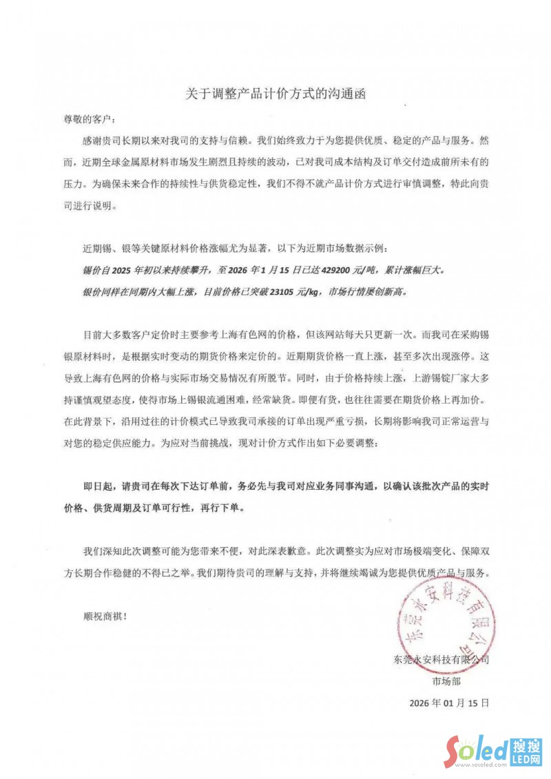 1月12日,高科華杰發(fā)布LED模組價格調(diào)整通知函表示,受銅、鐵、錫、鋁、燈珠、PCB 等主要原材料價格持續(xù)上漲影響,公司生產(chǎn)成本大幅增加。自當(dāng)日起,全系產(chǎn)品價格上調(diào) 3% 并執(zhí)行新價格體系;此前已確認(rèn)訂單,仍按原價履約。