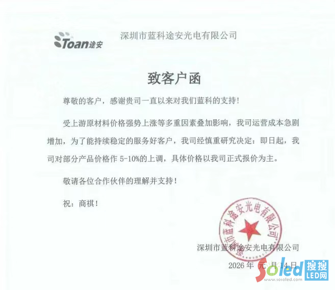 1月14日,藍(lán)科發(fā)布致客戶函表示,受上游原材料價格大漲等多重因素影響,公司運營成本劇增。為保障穩(wěn)定服務(wù)客戶,經(jīng)審慎研究,即日起對部分產(chǎn)品價格上調(diào) 5%-10%,具體以正式報價為準(zhǔn)。