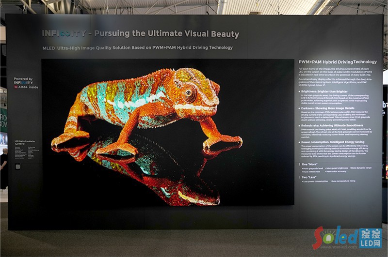 其中“無極 Infinity MLED超高畫質(zhì)解決方案”引人關(guān)注。憑借領(lǐng)先的智能算法與圖像處理引擎,控制系統(tǒng)、智能算法、全灰階校正與PWM+PAM混合驅(qū)動(dòng)IC的深度融合,讓MLED顯示屏獲得卓越表現(xiàn):細(xì)膩的光影層次、流暢的動(dòng)態(tài)畫面,讓“真實(shí)之美”躍然眼前,推動(dòng)MLED向萬億級(jí)商業(yè)及消費(fèi)級(jí)市場邁進(jìn)。